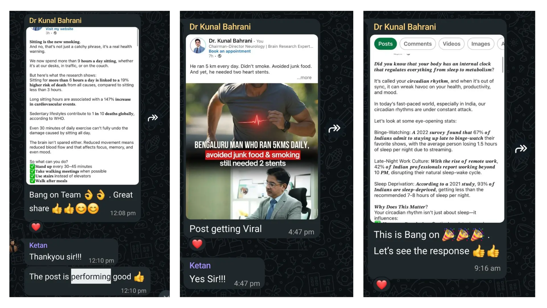 We conducted regular strategy meetings to understand his viewpoints, expertise, and real clinical experiences. Every post was built around his actual voice, not generic medical content.
